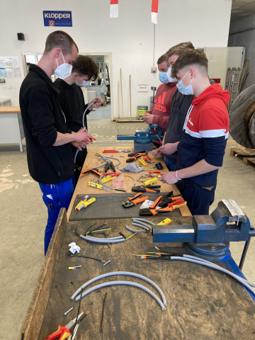 Vergangene Woche machten sich dann im Gegenzug die Schüler*innen auf den Weg nach Dortmund-Wambel zur Betriebsstätte der Firma Klöpper Elektrotechnik, die Mitglied im VDE ist. Eine schöne Abwechslung zum Lernalltag im Klassenraum: Berufsorientierung live und vor Ort! In zwei Kleingruppen wurden die Jugendlichen abwechselnd über das Betriebsgelände und durch die verschiedenen (Fertigungs-)Hallen geführt und durften in der unternehmenseigenen Ausbildungswerkstatt selbst tätig werden. Gemeinsam mit Ausbildungsleiter Björn Hoffmann und zwei Azubis haben die Schüler*innen u.a. ein- und mehradrige Leitungen bearbeitet und an einer Blackbox versucht, verschiedene Installationsschaltungen zu verdrahten. Das in der Schule erlernte theoretische Wissen konnte dort mit der Praxis verbunden werden. Außerdem bekamen sie an den Labortischen einen kurzen Überblick über die in der Ausbildung zu lernenden Fähigkeiten und Kenntnisse – alles aus erster Hand.